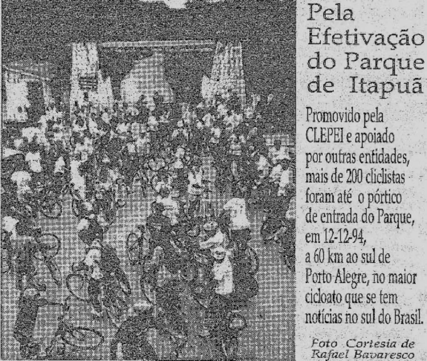 Promovido pela CLEPEI e apoiado por outras entidades, mais de 200 ciclistas foram até o pórtico de entrada do Parque em 12-12-94, a 60 km ao sul de Porto Alegre, no maior cicloato que se tem notícias no sul do Brasil.